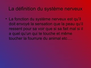 Le système nerveux a pour fonction principale de transmettre les sensations corporelles, comme la douleur ou le toucher. Il est composé de divers organes tels que le cerveau, le tronc cérébral, le cervelet et la moelle épinière, avec des nerfs crâniens reliant l'encéphale à ces structures. Sans ces nerfs, la survie serait compromise.