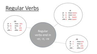 Le présent en français se traduit de trois manières en anglais, tandis qu'il n'y a qu'un seul temps présent en français. Les verbes réguliers se classifient en trois groupes selon leur terminaison et les conjugaisons sont illustrées avec divers exemples. Le document couvre également l'utilisation du présent pour des actions en cours, habituelles ou en relation avec le futur.