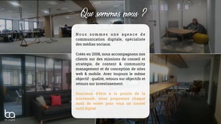 L'agence de communication digitale, spécialisée dans les médias sociaux depuis 2008, propose des services tels que le conseil, la stratégie et la création de sites web. Le document présente également Kahoot, un outil gratuit permettant de réaliser des sondages et quizz en temps réel, facilitant ainsi l'interaction lors de conférences et réunions. La simplicité d'utilisation de Kahoot est mise en avant, avec des fonctionnalités permettant de partager et analyser les résultats efficacement.
