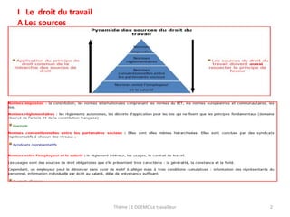 Le document traite du droit du travail, abordant son évolution historique et ses principaux principes, tels que le contrat de travail, la liberté du travail et le droit de grève, en insistant sur la protection des travailleurs face aux abus des employeurs. Il présente également des dates clés et des réformes législatives qui ont marqué la construction du droit du travail en France. Enfin, le texte discute des différents types de contrats de travail et des enjeux contemporains liés à l'emploi atypique et à la flexibilité du marché du travail.