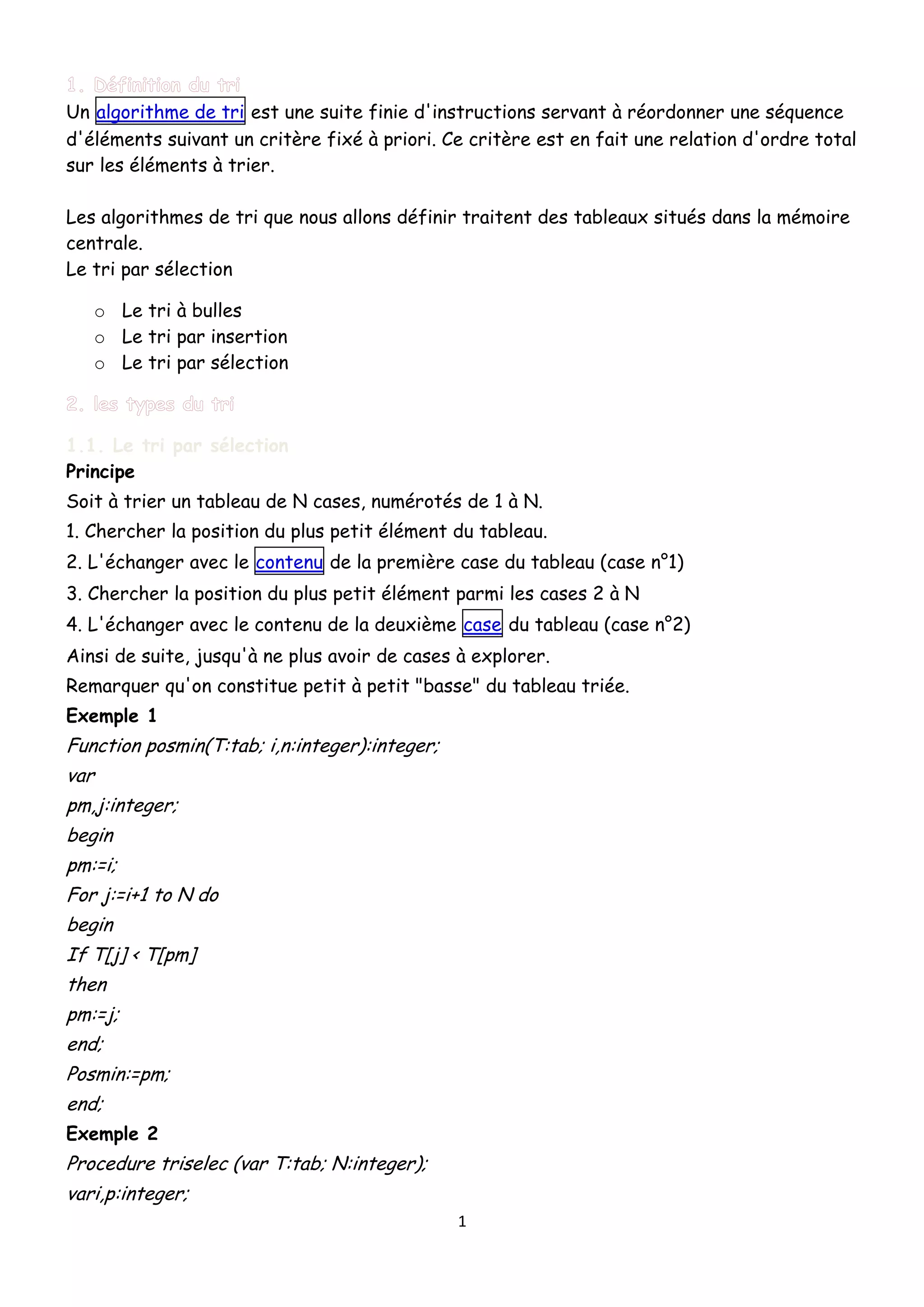 Un algorithme de tri réorganise une séquence d'éléments selon un critère d'ordre. Le document décrit plusieurs algorithmes de tri, notamment le tri par sélection, le tri à bulles et le tri par insertion, en présentant leurs principes et exemples de code. Chaque méthode est illustrée par une procédure qui démontre son fonctionnement sur un tableau d'entiers.