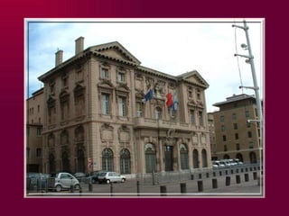 Le document décrit une visite de Marseille, mettant en avant des sites historiques tels que l'hôtel de ville barroque, le vieux quartier du Panier et la basilique Saint-Victor, entre autres. Il souligne l'importance de ces bâtiments en tant que témoins du passé, tout en illustrant l'architecture et l'histoire de la ville. La visite inclut des informations sur divers musées et monuments emblématiques, contribuant à la richesse culturelle de Marseille.