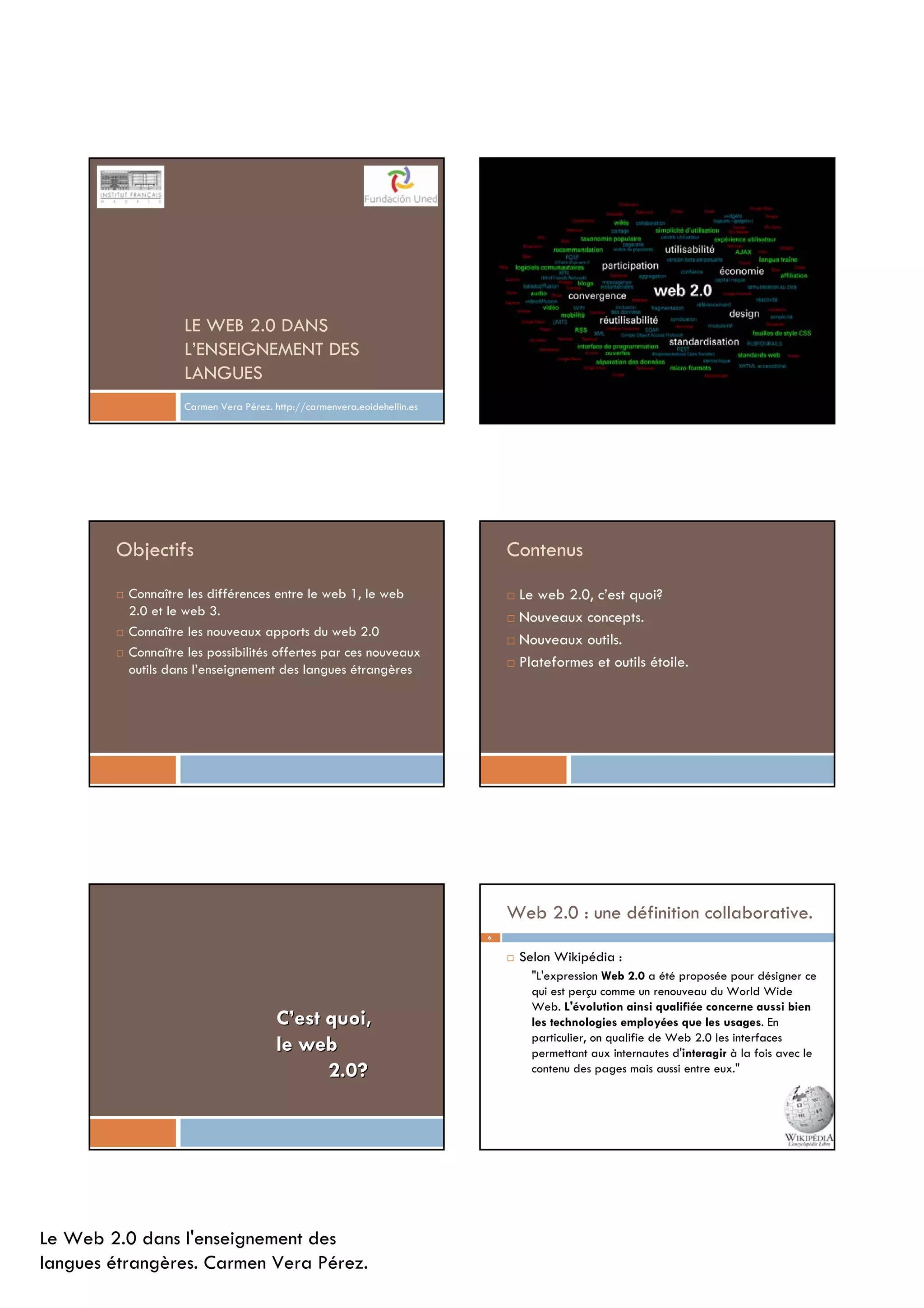 Le document traite de l'impact du Web 2.0 sur l'enseignement des langues, en expliquant les différences entre le Web 1.0, 2.0 et 3.0 tout en présentant divers outils collaboratifs tels que les blogs, wikis et réseaux sociaux. Il aborde également les nouvelles possibilités offertes par ces technologies pour encourager l'interaction, la communication et l'apprentissage actif des langues. Enfin, Carmen Vera Pérez souligne l'importance de ces outils multimédias pour enrichir l'enseignement et favoriser la créativité des élèves.