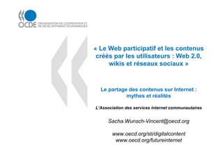 Le document discute du web participatif et de l'impact du contenu généré par les utilisateurs sur l'économie et la culture. Il souligne l'importance de la créativité, des nouvelles formes de participation civique et les défis liés à la propriété intellectuelle. En France, bien que le marché soit innovant et que des modèles d'affaires légitimes émergent, des problèmes persistent concernant l'accès au contenu et la réglementation.