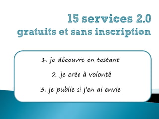 Le document présente une liste de 15 services Web 2.0 gratuits et sans inscription, permettant aux utilisateurs de créer et partager divers types de contenus en ligne tels que des fichiers audio, des graphiques, et des vidéos. Chaque service est décrit avec un guide en trois étapes pour faciliter l'utilisation, allant de la création à la publication. L'auteur, Isabelle Dremeau, encourage les utilisateurs à explorer et à créer à leur tour.