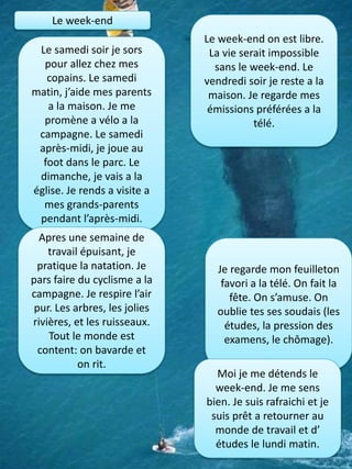 Le week-end est un moment de détente indispensable, loin des pressions du travail et des études. Les activités comprennent des sorties entre amis, du sport, et des moments en famille, ce qui permet de se ressourcer. Après ce temps de repos, on se sent prêt à affronter la semaine à venir.