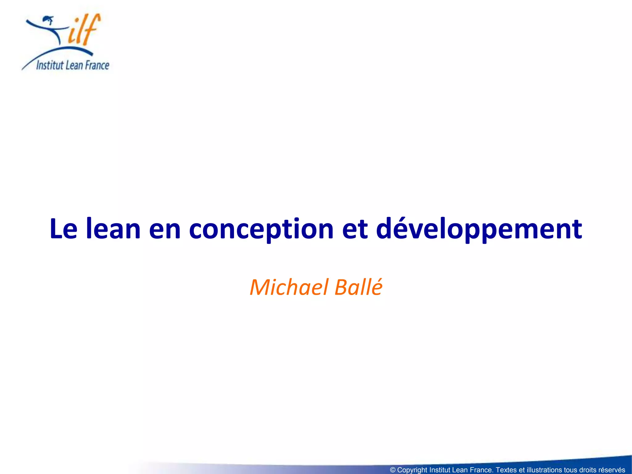 Le document présente le concept de Lean en conception et développement, en mettant l'accent sur l'étude de la valeur pour le client. Il explore les boucles d'apprentissage et les outils nécessaires pour optimiser le processus de développement de produits, tels que le concept paper, les standards de conception, et l'intégration des fournisseurs. Il insiste également sur l'importance de développer les équipes et de favoriser une culture d'apprentissage continu au sein de l'organisation.