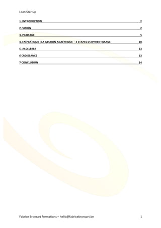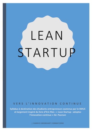 Le document présente le concept de lean startup, inspiré par le livre d'Éric Ries, qui vise à appliquer des méthodes de gestion lean pour optimiser le développement de jeunes entreprises en période d'incertitude. Il souligne l'importance de l'expérimentation, de la validation des enseignements et de l'itération rapide pour comprendre les besoins des clients, ainsi que la nécessité d'adapter les stratégies en fonction des retours obtenus. Cela permet de réduire le gaspillage et d'améliorer les chances de succès d'une startup en mettant l'accent sur les tests de produits minimums viables (PMV) et sur la capacité à pivoter lorsque les résultats ne sont pas satisfaisants.