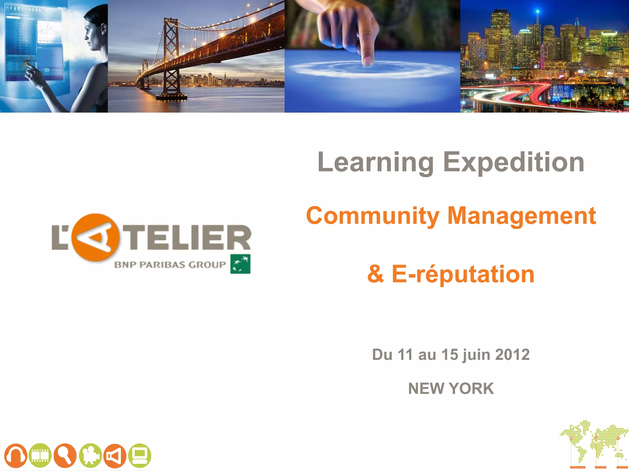 L'Atelier BNP Paribas organise une learning expedition à New York du 11 au 15 juin 2012, axée sur le community management et l'e-réputation, visant à plonger dans les dernières tendances digitales. Les participants auront l'opportunité de rencontrer des acteurs clés de la Silicon Valley et de développer des stratégies d'innovation numérique. Le programme comprend des présentations, des visites de startups et des séances de débriefing pour appliquer les enseignements dans leurs entreprises.