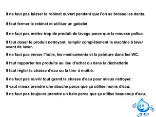 Le document aborde l'importance d'économiser l'eau dans les pratiques domestiques, comme ne pas laisser le robinet ouvert en se brossant les dents et fermer la chasse d'eau correctement. Il met en avant que l'usage domestique de l'eau constitue environ 15% de l'utilisation de l'eau douce dans le monde, avec de grandes disparités entre les pays. Enfin, il souligne les impacts environnementaux des detergents et les quantités d'eau gaspillées lors de diverses activités domestiques.