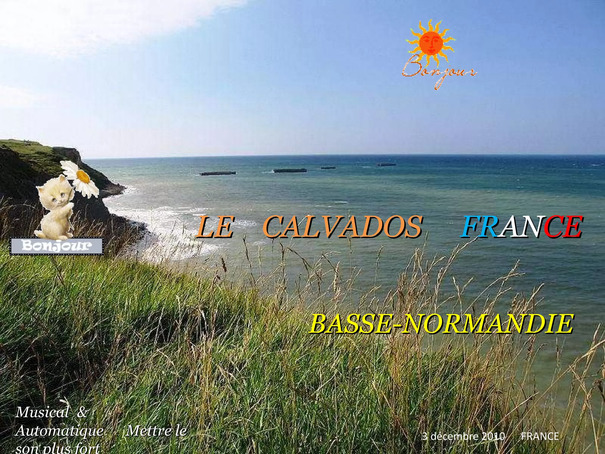Le document présente divers lieux et attractions dans le Calvados, en Basse-Normandie, notamment des châteaux, des églises et des paysages côtiers. Il inclut des références historiques et culturelles, ainsi que des villes comme Lisieux, Honfleur, et Caen, avec des descriptions des sites remarquables. La pièce évoque également la musique, illustrant une ambiance locale en rapport avec les lieux mentionnés.