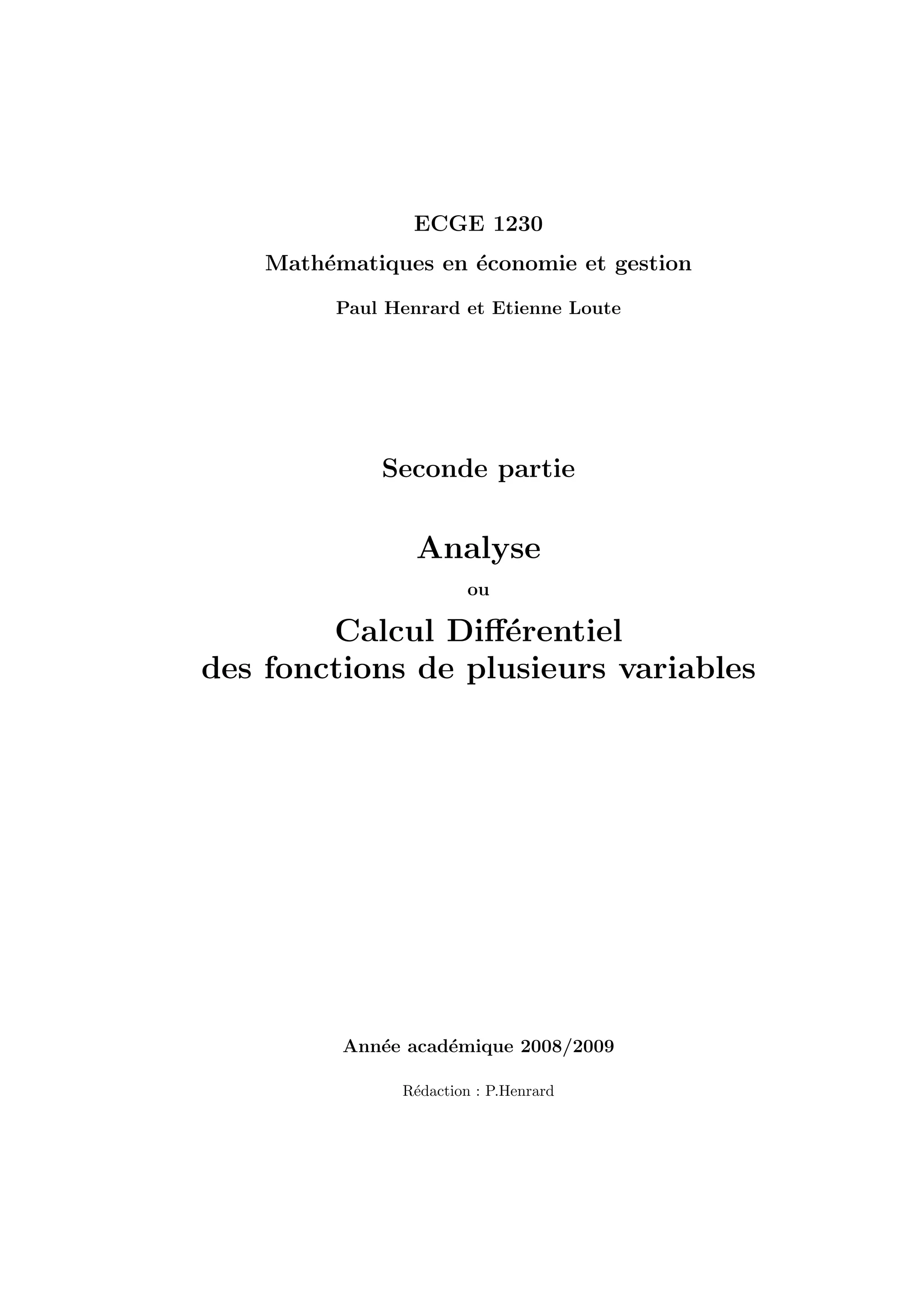 Ce document présente les notions de base liées aux fonctions de plusieurs variables en mathématiques, en particulier leur analyse et leur représentation géométrique. Il traite des concepts tels que les limites, la continuité, les dérivées partielles, ainsi que des outils pour représenter graphiquement les fonctions à deux variables. L'accent est mis sur l'importance de la compréhension géométrique pour une meilleure intuition des principes de l'analyse des fonctions multivariables.
