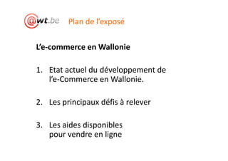 L'e-commerce en Wallonie est en plein essor, avec plus de la moitié des Belges ayant acheté en ligne en 2011, soulignant les opportunités et défis du secteur. Malgré une croissance, plusieurs obstacles tels que le manque de stratégie et la gestion logistique restent à surmonter pour les entreprises. Diverses aides sont disponibles pour accompagner les acteurs du e-commerce dans leur développement et leur formation.