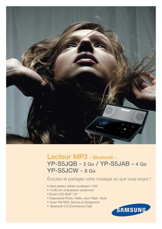 Le document décrit le lecteur MP3 Bluetooth YP-S5 avec des capacités de stockage variant de 2 à 8 Go, un haut-parleur stéréo intégré, une autonomie de 24 heures, et un écran LCD de 1,8 pouce. Il offre des fonctionnalités multimédia telles que la lecture de musique, vidéos, photos, ainsi que des options de dictaphone et de tuner FM. Ce lecteur est conçu pour un partage facile de la musique et est compatible avec divers formats audio et photo.