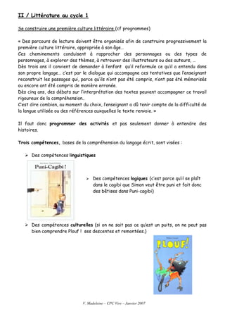 Le document traite de l'album de littérature de jeunesse au cycle 1, en définissant ses caractéristiques et en soulignant l'importance de la narration conjuguée entre texte et image. Il établit également des parcours de lecture pour développer la culture littéraire chez les enfants, en insistant sur la nécessité d'activités visant à renforcer la compréhension du langage écrit. Enfin, il aborde les techniques de narration et les schémas narratifs, tout en proposant des pistes pédagogiques pour enrichir l'expérience de lecture.