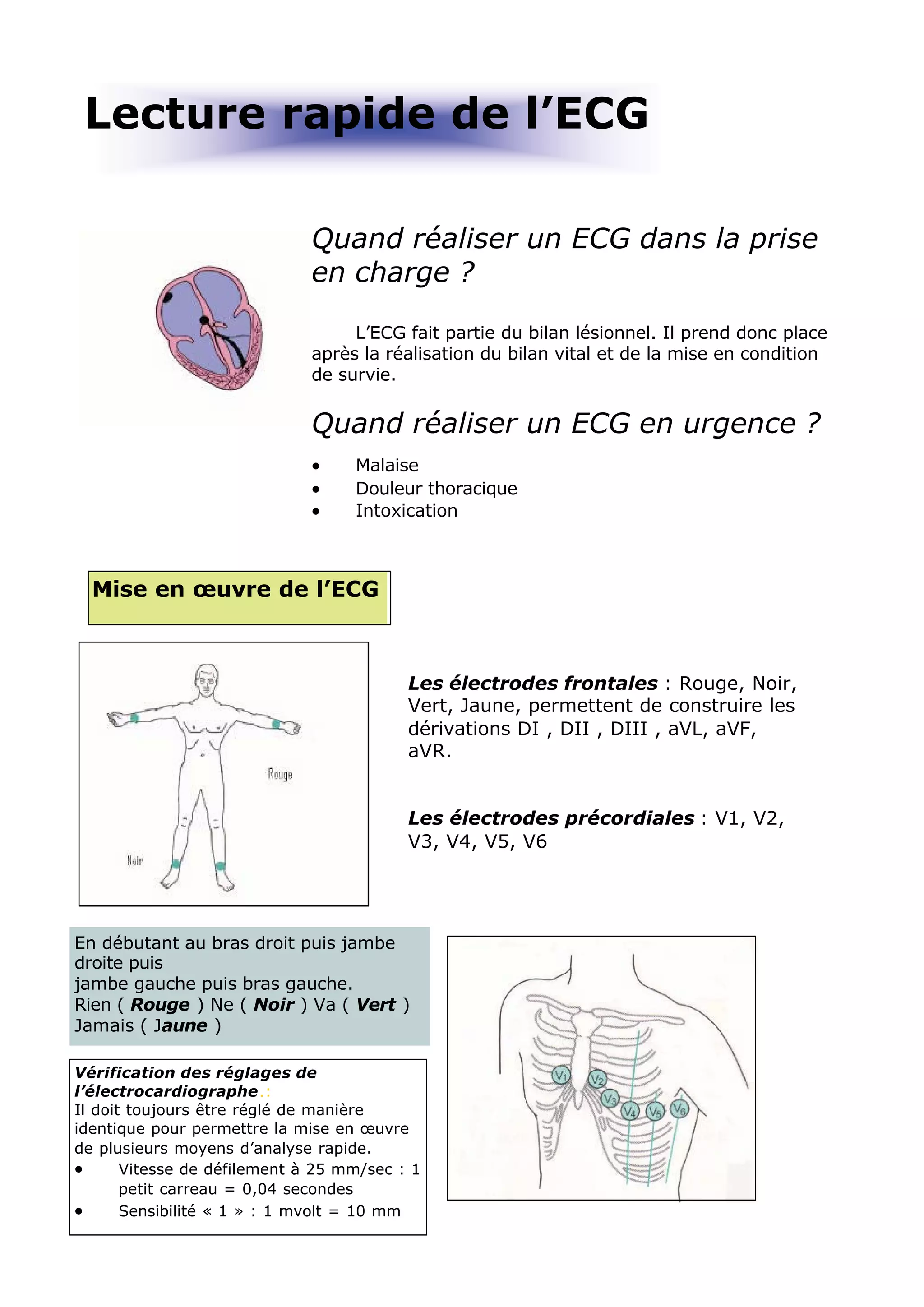 L'ECG est essentiel dans la prise en charge des urgences comme les malaises ou douleurs thoraciques, après le bilan vital. Son analyse rigoureuse nécessite de vérifier la position des électrodes, la fréquence, le rythme, et les troubles de repolarisation, en confrontation avec les signes cliniques. Les traitements des troubles du rythme incluent des médicaments et des interventions spécifiques selon le type de tachycardie ou bradycardie rencontrés.