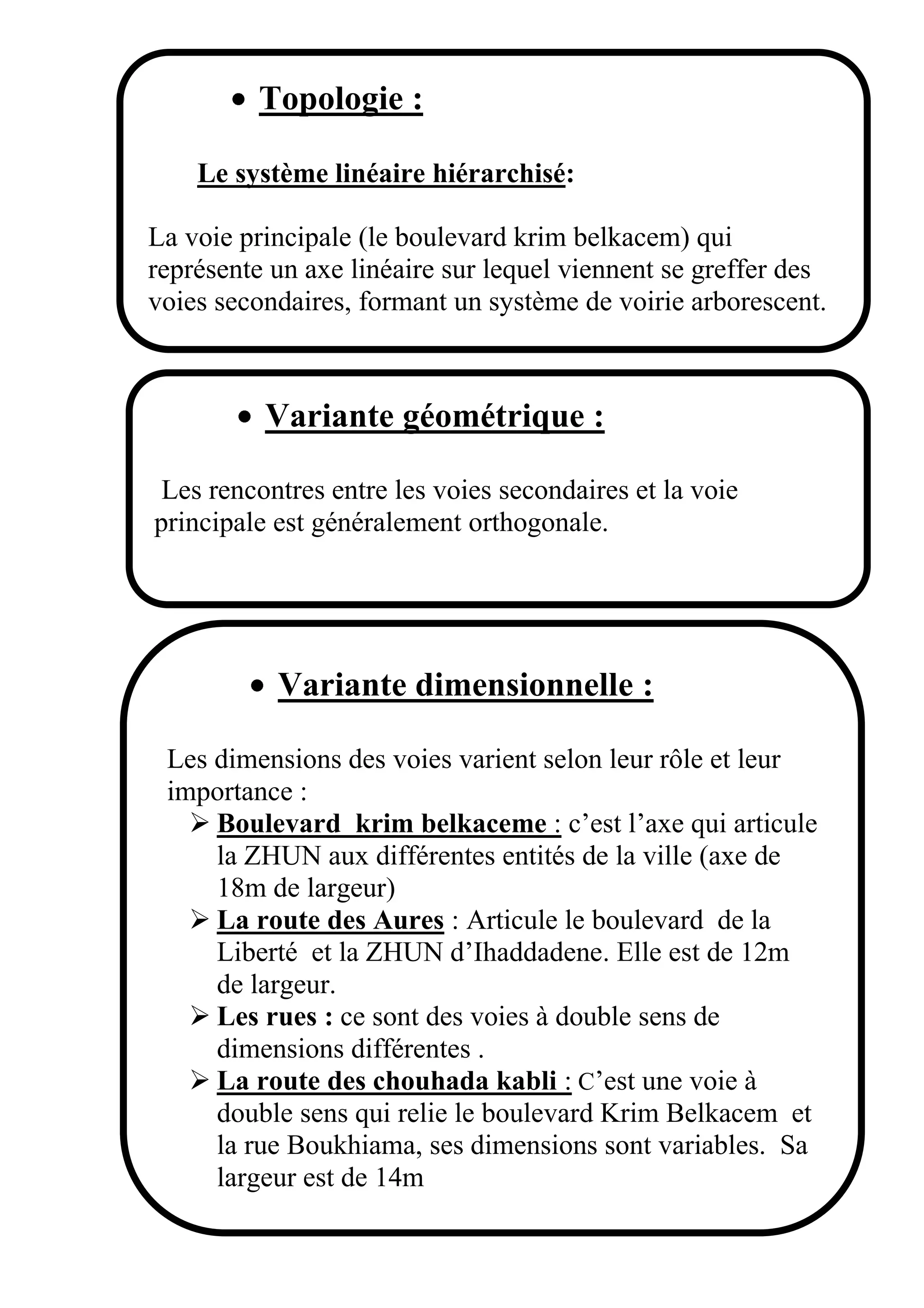 Le document décrit une hiérarchie des voies dans un système urbain, où la voie principale (boulevard Krim Belkacem) est articulée par des voies secondaires de diverses dimensions. Il analyse également la topologie des bâtiments et des espaces libres, soulignant une homogénéité dimensionnelle et des variations géométriques. Enfin, il aborde la transformation des îlots dans l'espace urbain, marquant un changement dans leur forme et dimensions.