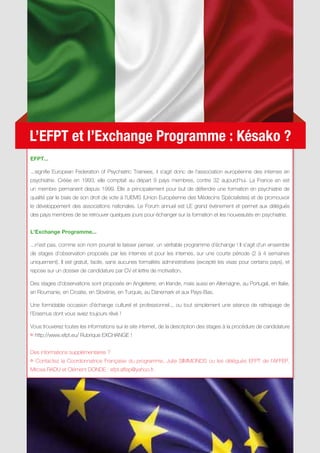L'EFPT (European Federation of Psychiatric Trainees) est une association créée en 1993 qui regroupe 32 pays membres, dont la France, pour promouvoir une formation de qualité en psychiatrie. Le programme d'échange proposé permet aux internes de réaliser des stages d'observation dans divers pays européens, favorisant ainsi les échanges culturels et professionnels. Les détails et les candidatures pour ces stages sont disponibles sur le site internet de l'EFPT.