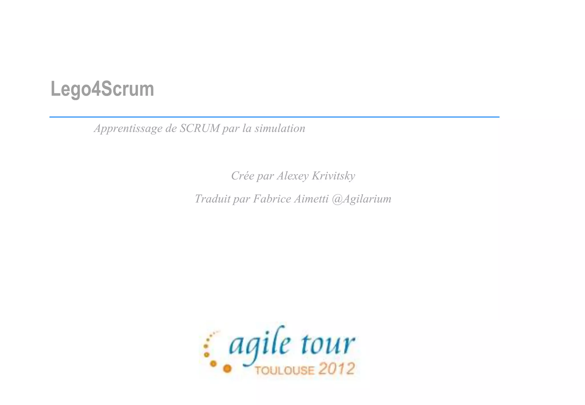 Le document présente une approche d'apprentissage de la méthode Scrum par la simulation utilisant des Lego, organisée par Antoine Vernoise et Philippe Launay. Il décrit la création d'équipes auto-organisées, les règles du jeu, la gestion du backlog, ainsi que les itérations des sprints et les débriefings. Le projet vise à aider les participants à comprendre les dynamiques de Scrum en construisant une ville imaginaire avec des Lego.