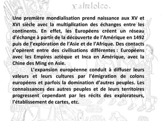 Entre le XVème et XVIème siècles, une première mondialisation émerge avec les échanges entre l'Europe, l'Amérique, et l'Asie, favorisés par des explorations maritimes et des conquêtes. Les contacts entre civilisations, notamment à travers la domination européenne et les expéditions chinoises, engendrent des impacts variés sur les cultures et les politiques. Cela illustre un mélange d'aspirations commerciales, d'évangélisation, et de rivalités entre puissances pour contrôler les routes maritimes et les ressources.