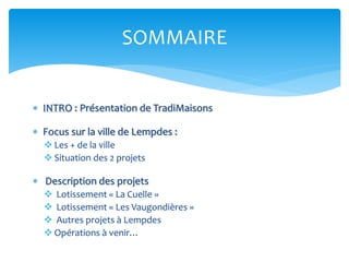 Le document présente les projets de lotissements « la cuelle » et « les vaugondières » à Lempdes, soulignant les caractéristiques de la ville et les avantages de ces projets immobiliers. Tradimaisons, constructeur de maisons individuelles, est responsable des développements, offrant diverses options de maisons et un suivi personnalisé. Les projets incluent des maisons de plain-pied et à étage, avec un accent sur l'emplacement, l'accès aux services et la qualité de construction.