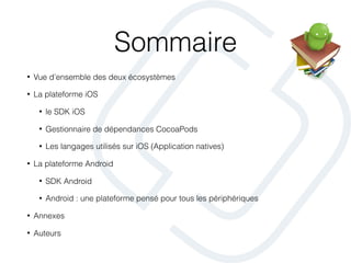 Ce document fournit une vue d'ensemble des écosystèmes de développement mobile iOS et Android, en détaillant leurs plateformes, SDK, langages de programmation, et outils de développement. Il aborde les spécificités de chaque système, notamment la gestion des dépendances, la fragmentation des tailles d'écran, et les défis liés au développement mobile. Les langages utilisés incluent Objective-C et Swift pour iOS, tandis qu'Android se concentre sur des outils modernes comme Android Studio et la prise en charge de divers périphériques.