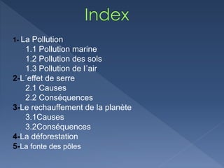 Le document traite des problématiques environnementales majeures telles que la pollution (marine, des sols, de l'air), l'effet de serre, le réchauffement climatique, la déforestation et la fonte des pôles. Il explique que la pollution degrade les écosystèmes, tandis que le réchauffement climatique a des conséquences graves sur les températures mondiales, les écosystèmes et les populations vulnérables. Enfin, il souligne l'urgence de la situation, notamment avec la déforestation et la disparition des glaciers aux pôles.
