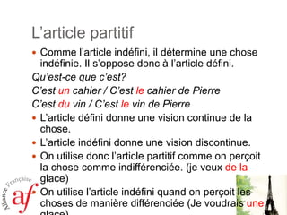 Ce document présente la leçon 6 d'un cours de français pour débutants niveau A1.1, abordant l'utilisation des articles partitifs, indéfinis et définis dans diverses contextes. Il couvre également les différentes manières d'interroger et de répondre en français, ainsi que la manière d'exprimer la possession.
