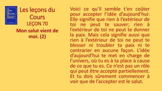 Leçon 70 enseigne que le salut et la culpabilité proviennent de notre propre esprit, et qu'il n'existe rien à l'extérieur de nous qui puisse nous apporter paix ou guérison. En reconnaissant cela, on s'aligne avec la volonté de Dieu qui souhaite notre guérison. Les exercices proposés encouragent la prise de conscience que notre salut réside en nous, libérant ainsi notre esprit des illusions extérieures.