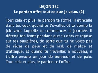 Le pardon est présenté comme la clé pour atteindre la paix, le bonheur et un sens profond de la sécurité et de la valeur. Il offre des bénéfices transcendants qui dépassent les désirs matériels et les illusions du monde. En acceptant le pardon, on accède au salut et à une vie remplie de sérénité et de joie véritable.