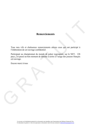 Le document est un témoignage humoristique et narratif sur l'apprentissage et la pratique du poker, centré sur les expériences d'un joueur et de son grand-père. Il aborde les règles du jeu, les stratégies, et évoque l'importance de la discrétion ainsi que la culture qui l'entoure. L'auteur partage également sa perspective sur l'argent et le caractère aventurier du poker, en soulignant la différence entre le poker traditionnel et d'autres jeux de société.