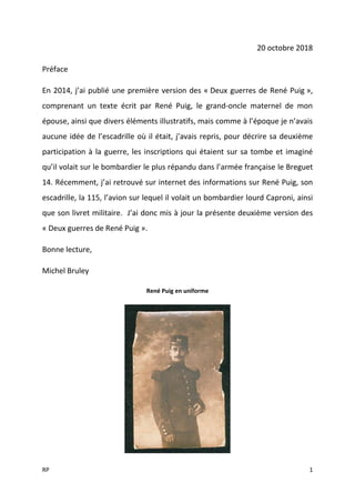 Le document décrit les expériences de René Puig pendant les deux guerres, y compris sa captivité et ses tentatives d'évasion. Après avoir obtenu des informations sur son escadrille et son avion, l'auteur, Michel Bruley, présente une version mise à jour de son histoire. La narration met en lumière les difficultés rencontrées lors de la guerre, ainsi que les détails des plans d'évasion et des interactions avec des soldats allemands.