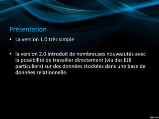Le document présente les évolutions des annotations des EJB à travers les versions, en soulignant les simplifications apportées par la version 3.0, telles que le remplacement de fichiers XML par des annotations directes dans le code. Il décrit également les différentes annotations disponibles pour la déclaration des types de beans, l'injection de dépendances, la gestion des transactions et la sécurité. Enfin, le document aborde les implications potentielles de l'utilisation d'annotations, notamment la complexification de la gestion de la configuration.