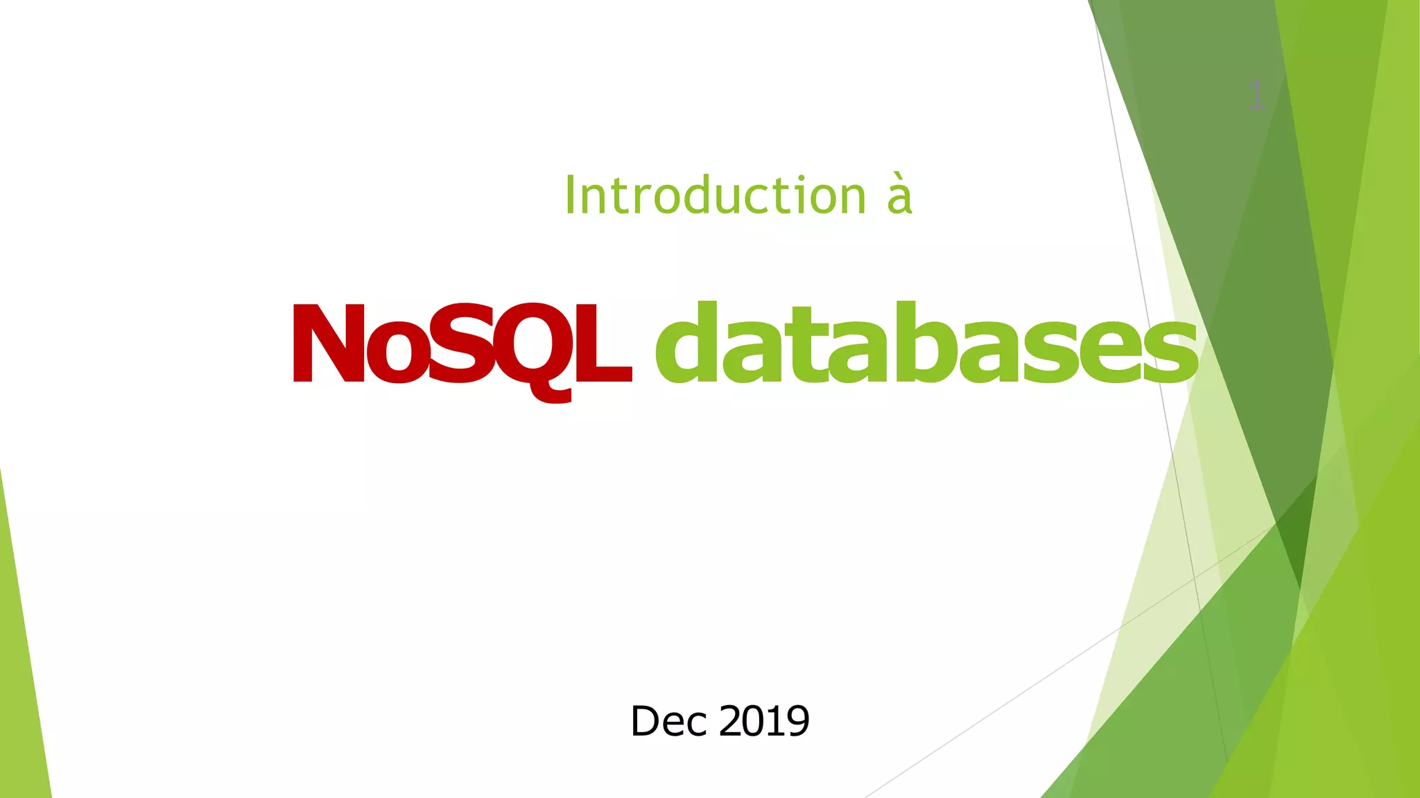 Ce document présente une introduction aux bases de données NoSQL, mettant en avant leurs différences par rapport aux bases de données relationnelles traditionnelles, notamment en matière de scalabilité et de gestion des données. Il aborde les concepts fondamentaux comme ACID et BASE, ainsi que les types de bases de données NoSQL comme les bases de données clé-valeur, documentaires, de colonnes et graphiques. Enfin, il explore les défis liés à l'informatique distribuée et le théorème CAP qui stipule que dans les systèmes de bases de données distribué, il est impossible de garantir simultanément cohérence, disponibilité et tolérance aux partitions.
