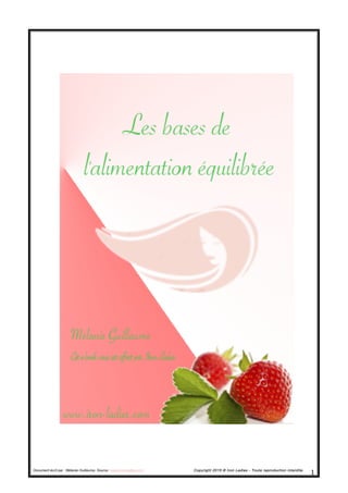 Le document présente les bases d'une alimentation équilibrée, soulignant l'importance des macronutriments (protéines, lipides, glucides) et micronutriments (vitamines, minéraux) pour le fonctionnement optimal du corps humain. Il explique également comment adapter son alimentation en fonction de facteurs tels que le sexe, l'âge et le niveau d'activité physique. Enfin, le texte met en garde contre les produits alimentaires non optimaux et insiste sur le choix judicieux des sources de nutriments.