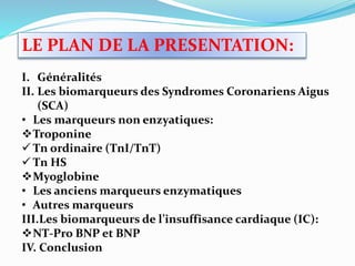 Le document aborde l'importance des biomarqueurs cardiaques dans le diagnostic et le suivi des syndromes coronariens aigus et de l'insuffisance cardiaque, mettant en avant la troponine, en particulier la troponine ultrasensible, comme référence pour détecter des lésions myocardiques. Il souligne la nécessité d'améliorer la spécificité des tests tout en reconnaissant leur potentiel pronostique et thérapeutique. Enfin, il évoque les défis actuels et futurs dans la recherche de biomarqueurs cardiaques plus performants.