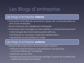 Le document présente une définition technique des blogs, leur historique, et met en lumière les outils de création et les fonctions spécifiques des blogs par rapport aux sites web et forums. Il aborde également l'utilisation des blogs en entreprise, en détaillant leurs types interne et externe ainsi que leurs objectifs comme le marketing et la communication. Enfin, il souligne les caractéristiques qui distinguent les blogs des micro-blogs et des forums.