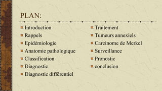 Le document présente un examen complet des carcinomes cutanés, en détaillant les types (carcinome épidermoïde et basocellulaire), leur étiologie, la prévention, ainsi que le diagnostic et le traitement. Il souligne l'importance de la prévention face à l'exposition solaire et les risques liés à certaines lésions précancéreuses. Finalement, il aborde les méthodes de diagnostic et de classification pour un meilleur suivi des patients.