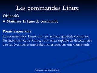 Le document traite des commandes Linux, en se concentrant sur leur syntaxe et leur fonctionnement à travers des exemples pratiques. Il explique les différents types de commandes, comment naviguer dans les répertoires, et les différentes options disponibles pour chaque commande. Enfin, il aborde l'utilisation de l'éditeur 'vi', leur fonctionnement et l'historique des commandes exécutées.