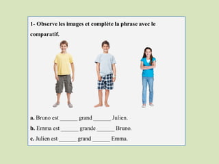 Le document traite des comparatifs et superlatifs des adjectifs en français, en expliquant les formes de supériorité, d'infériorité et d'égalité. Il présente également des comparatifs et superlatifs irréguliers, ainsi que des exemples d'utilisation dans des phrases. Des exercices pratiques sont fournis pour compléter des phrases avec des superlatifs.