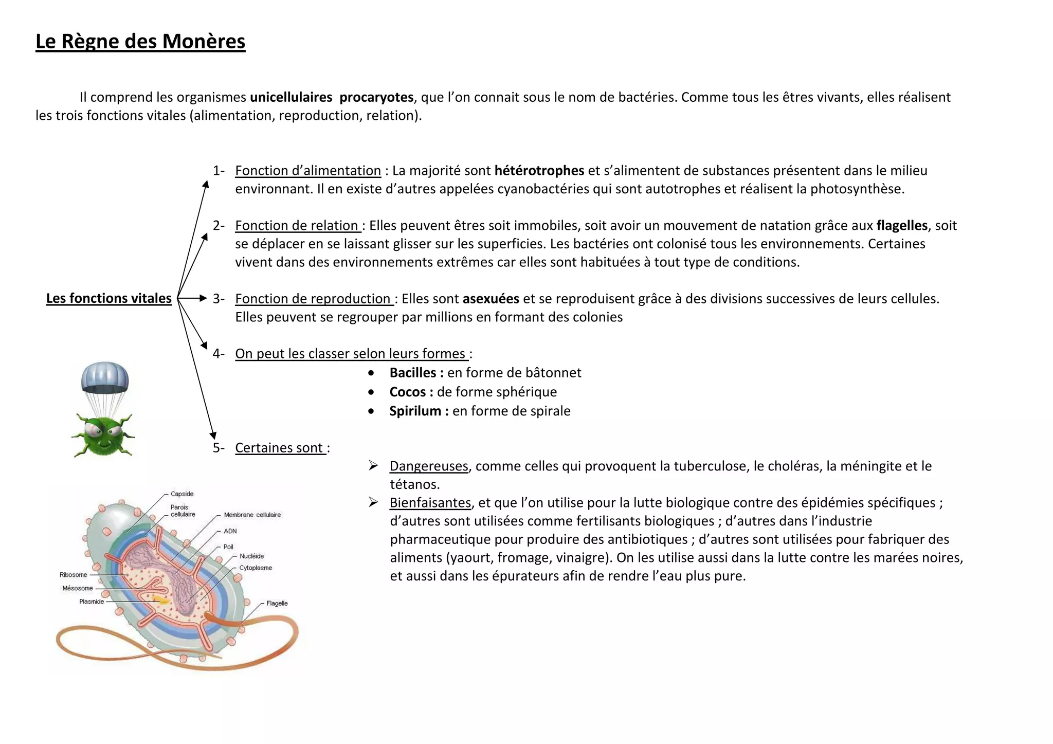 Le document décrit les différents règnes du vivant, notamment les monères (bactéries), protistes, mycètes (champignons) et plantes. Chaque règne est caractérisé par des propriétés spécifiques liées à leur type de cellule, mode de nutrition et reproduction, ainsi que leur utilité ou dangerosité pour l'homme et l'environnement. Le texte aborde également les systèmes de déplacement et les relations écologiques de ces organismes.