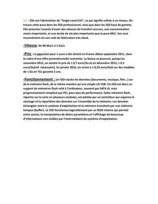 Le document présente différents types de disques durs, notamment les SSD, SCSI, SATA et IDE/ATA, en détaillant leurs caractéristiques, avantages et inconvénients. Les SSD sont plus rapides et moins consommateurs d'énergie, mais leur coût reste élevé par rapport aux disques durs mécaniques. Les autres interfaces comme SCSI et SATA offrent diverses vitesses et méthodes de connexion, chacune ayant ses propres spécificités techniques.