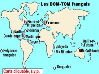 Le document décrit les différents statuts administratifs des départements et territoires d'outre-mer français, en précisant les modifications apportées en 2003. Il aborde également des caractéristiques spécifiques des régions comme la Guyane, la Guadeloupe et la Réunion, ainsi que l'histoire des collectivités d'outre-mer. Enfin, il mentionne les terres australes et antarctiques françaises ainsi que des programmes scientifiques en cours dans ces régions.