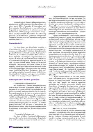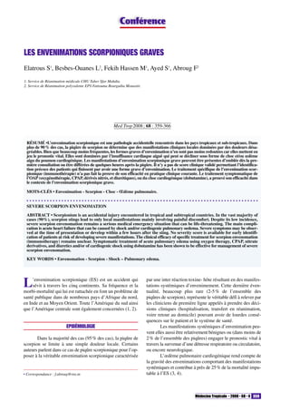 L'envenimation scorpionique est un problème de santé publique majeur dans les pays tropicaux, où 90% des piqûres ne causent que des douleurs locales, mais des formes graves peuvent entraîner des complications potentiellement mortelles, notamment une insuffisance cardiaque aiguë. Les manifestations systémiques peuvent apparaître immédiatement ou plusieurs heures après la piqûre, et il n'existe pas de score clinique validé pour prédire leur gravité. Le traitement symptomatique s'avère efficace pour gérer les complications graves, mais l'efficacité de l'immunothérapie reste incertaine.