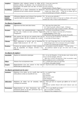 Le document traite des figures de style, qui sont des procédés permettant d'enrichir l'expression en littérature et dans le langage courant. Il présente diverses catégories de figures, incluant celles par analogie, de substitution, d'insistance, d'atténuation et d'opposition, avec des exemples illustratifs pour chacune. Ces figures servent à créer des effets stylistiques variés comme la métaphore, l'hyperbole, ou l'antithèse.