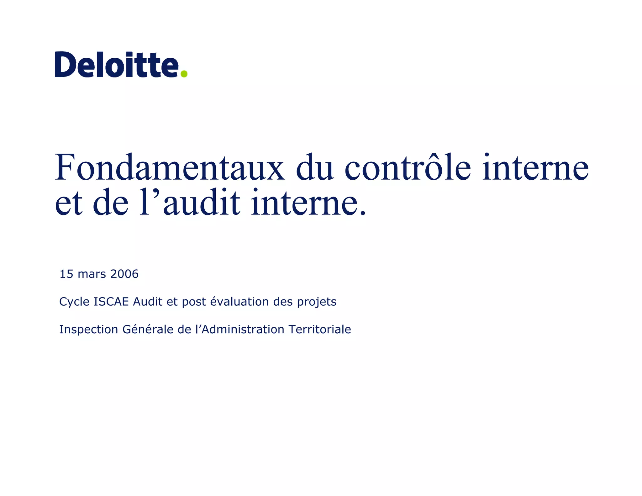 Le document présente les fondamentaux du contrôle interne et de l’audit interne, abordant des concepts clés tels que la définition des risques, les objectifs du contrôle interne et l'importance de l'audit comme outil d'amélioration des performances organisationnelles. Il souligne le besoin croissant de dispositifs efficaces dans un contexte de complexité économique et réglementaire, ainsi que la nécessaire distinction entre contrôle interne et audit interne. Enfin, le texte met en avant l'importance de la planification et de l'évaluation des missions d'audit au sein d'une organisation.