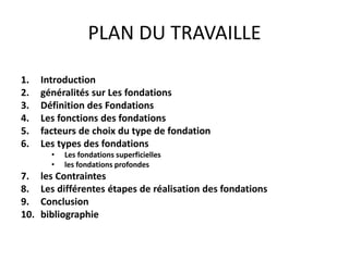 Le document traite des fondations des bâtiments, de leur définition à leurs types (superficielles et profondes) ainsi que des facteurs influençant leur choix. Il aborde également les contraintes à considérer lors de leur conception et les différentes étapes de leur réalisation, y compris le drainage et le remblaiement. En conclusion, il souligne l'importance des fondations pour assurer la stabilité et la sécurité des constructions.