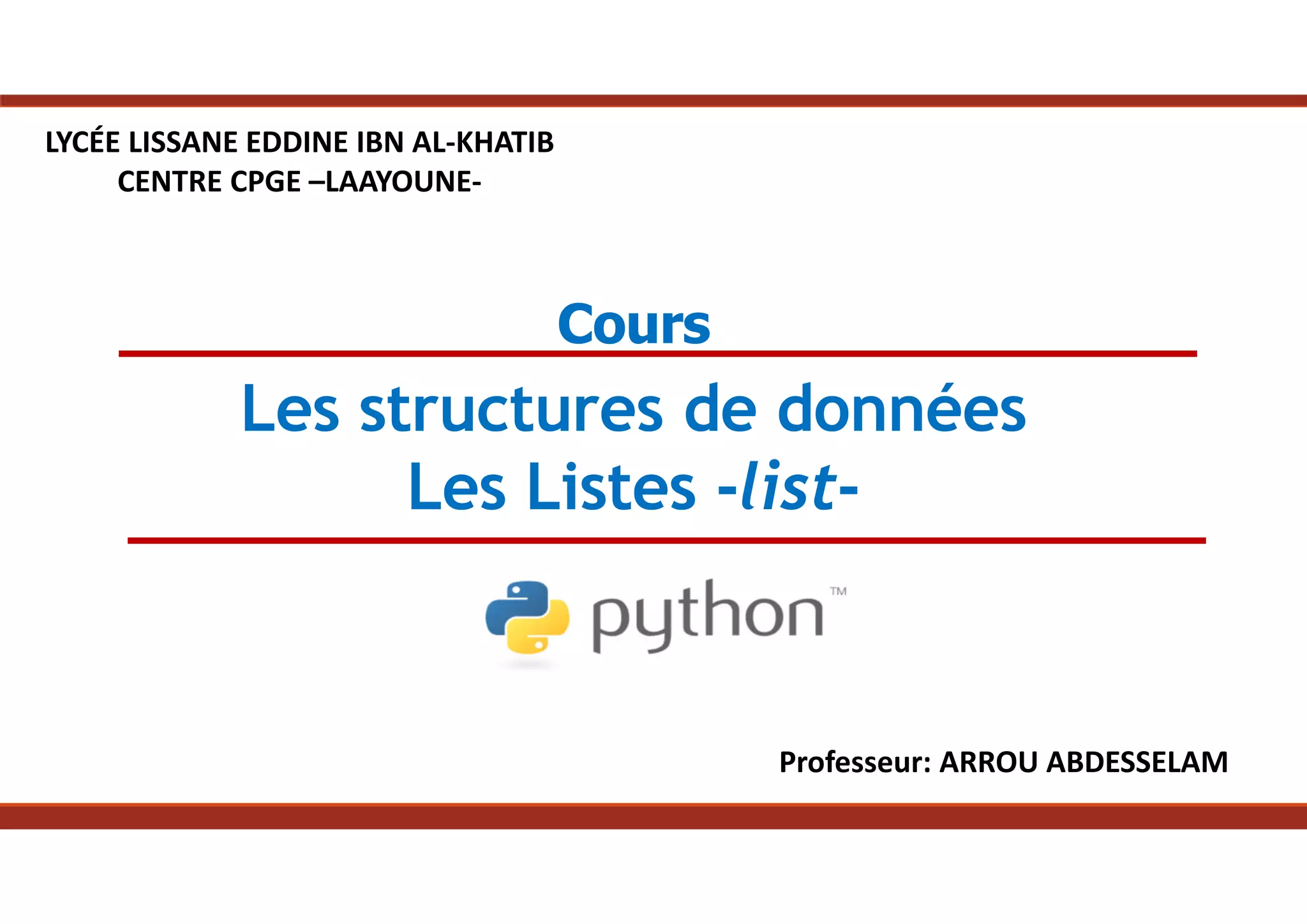 Le document traite des structures de données en Python, en se concentrant sur les listes, qui permettent de stocker des séquences d'objets hétérogènes. Il aborde la création de listes, l'accès à leurs éléments par indexation et slicing, ainsi que diverses opérations et méthodes associées telles que la concaténation, l'insertion, la suppression et la copie des listes. Le document se conclut par des exercices pratiques pour appliquer les concepts expliqués.