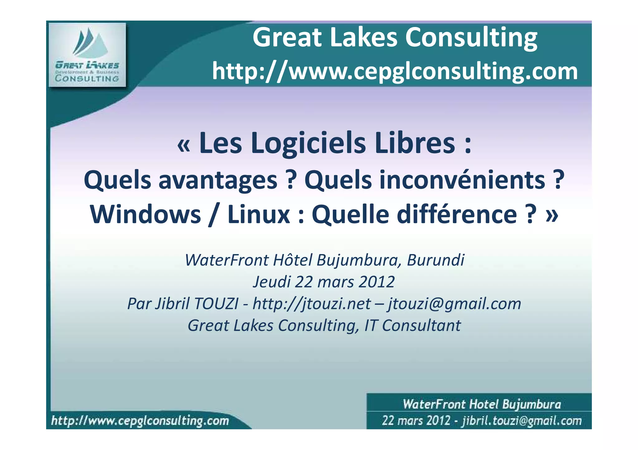 Le document présente les avantages et inconvénients des logiciels libres, mettant en lumière leur définition et les quatre libertés essentielles selon la Free Software Foundation. Il compare également Linux et Windows sur divers aspects tels que la liberté de licence, la sécurité et la flexibilité, tout en offrant une liste de logiciels équivalents sous chaque système. Enfin, il traite des opportunités de déploiement d'un projet de logiciel libre et souligne les défis liés à l'intégration de matériel et à la compatibilité.