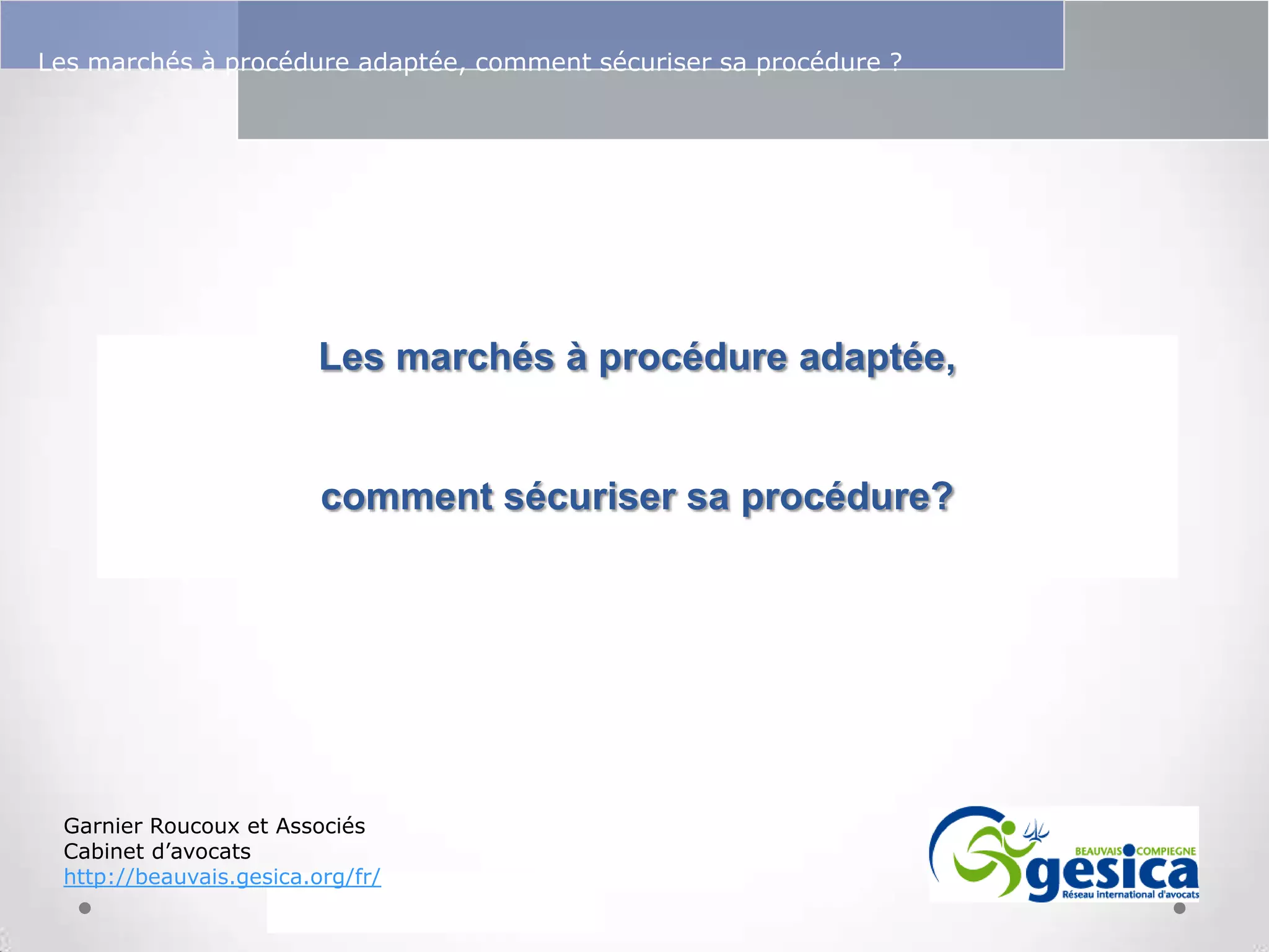 Le document aborde la gestion des risques dans le cadre des marchés publics à procédure adaptée, soulignant l'importance de la connaissance des règles et des procédures pour éviter des erreurs contractuelles. Il détaille les obligations de publicité et de mise en concurrence selon le montant des marchés, ainsi que les exceptions à ces règles. Enfin, il identifie des types de marchés et des principes de transparence et d'égalité de traitement qui doivent être respectés par les collectivités dans leurs achats.